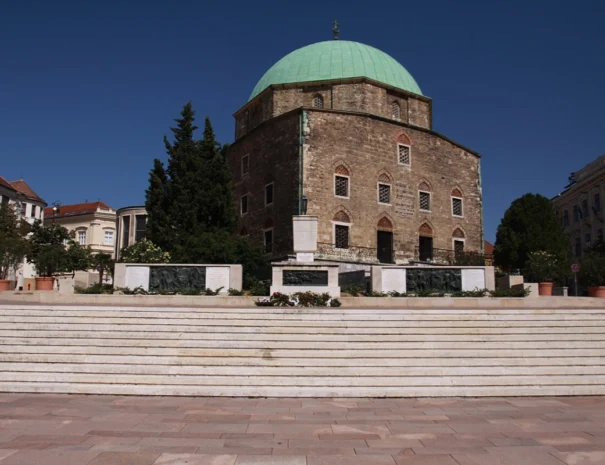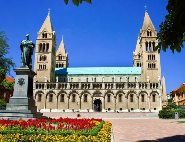 A Szent István téren magasodik a lenyűgöző Pécsi Dóm, amely a város egyik legmeghatározóbb jelképe. A négy karcsú torony már messziről uralja a látképet, és méltóságteljesen hirdeti a több mint ezeréves keresztény hagyományt.